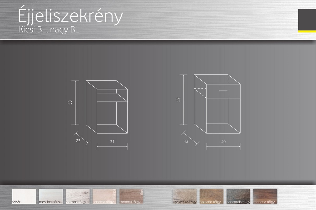 Nagy BL éjjeliszekrény mérete: